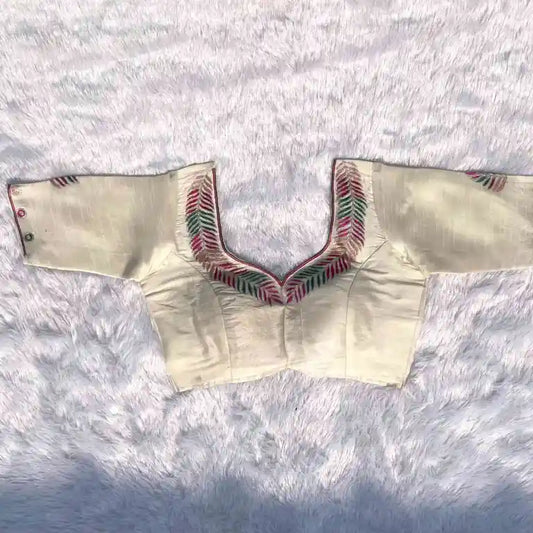 White Multicolor HandWork Neck Embroidery Line Raw Silk Blouse - Fal3157