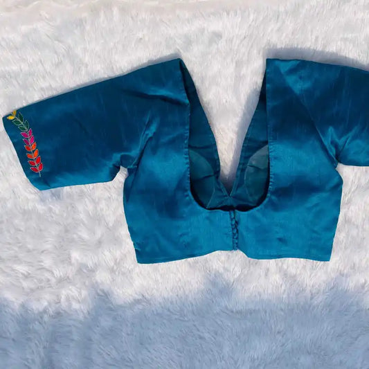 Teal Blue Multicolor HandWork Embroidery V Neck Raw Silk Blouse - Fal3153