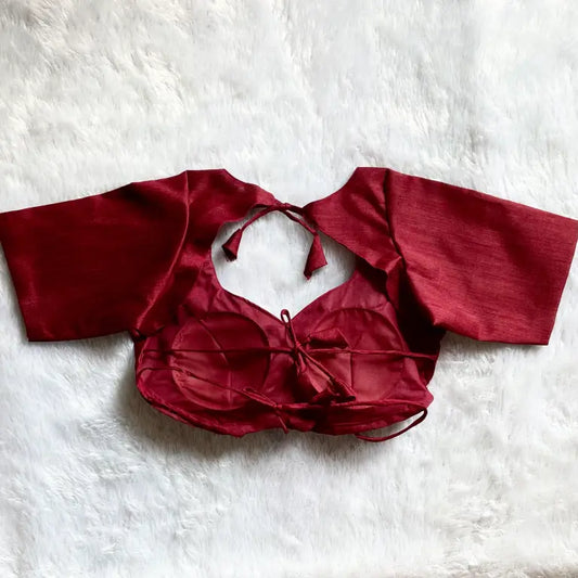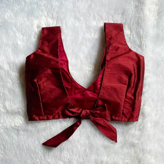 Maroon Deep V Neck and Back Knot Plain Raw Silk Blouse - Fal3119