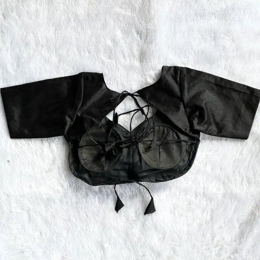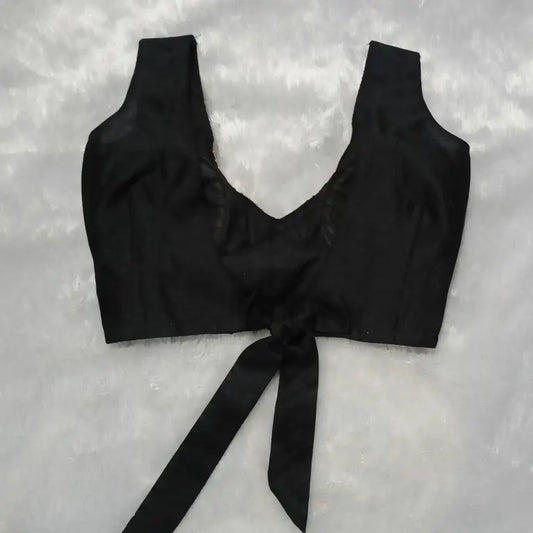 Black Deep V Neck and Back Knot Plain Raw Silk Blouse - Fal3118