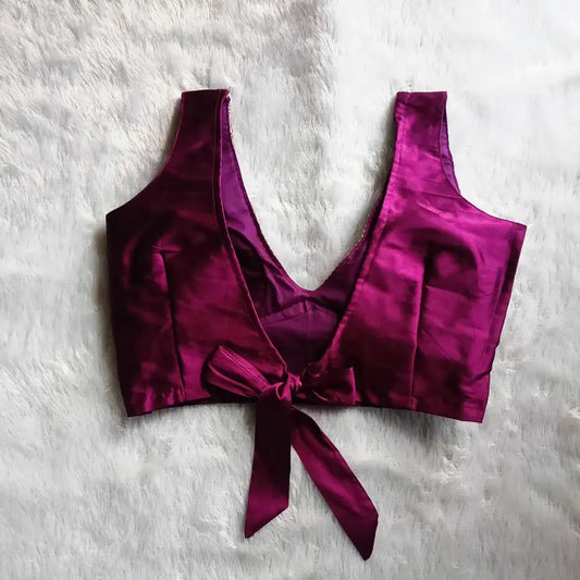 Wine Deep V Neck and Back Knot Plain Raw Silk Blouse - Fal3105