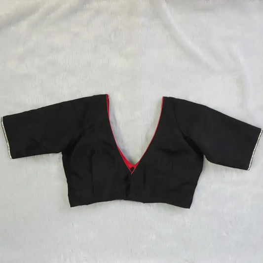 Black Deep V Neck with Red Piping and Back Potli Button Plain Raw Silk Blouse - Fal3108