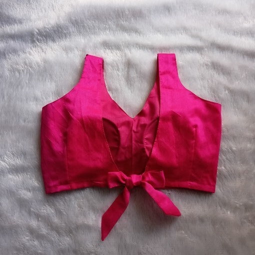 Rani Pink Deep V Neck and Back Potli Button Plain Raw Silk With Handmade Tassles Blouse - Fal3094