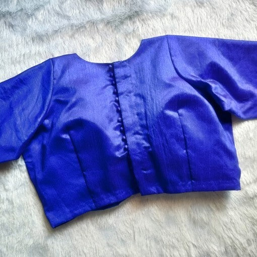 Blue Deep V Neck and Back Full Potli Button Plain Raw Silk Blouse - Fal3076