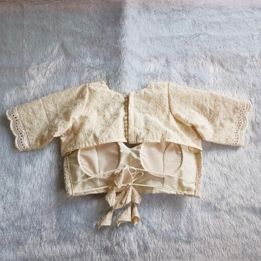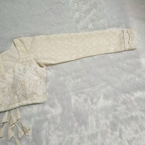 White Chikan Embroidery Full Sleeves Back Knot Cotton Blouse - Fal3079