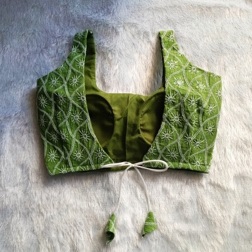 Olive Green Chikan Embroidery Cotton Blouse - Fal3084