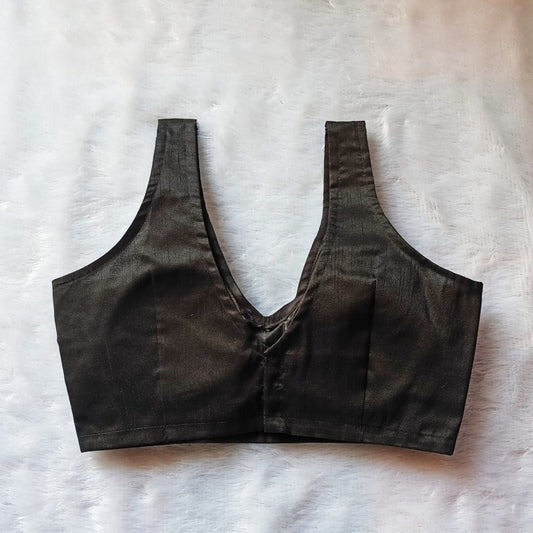 Black V Neck Plain Raw Silk Blouse - Fal3082