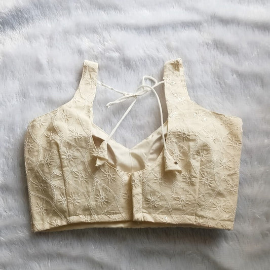 White Chikan Embroidery V Neck Back Knot Cotton Blouse - Fal3077