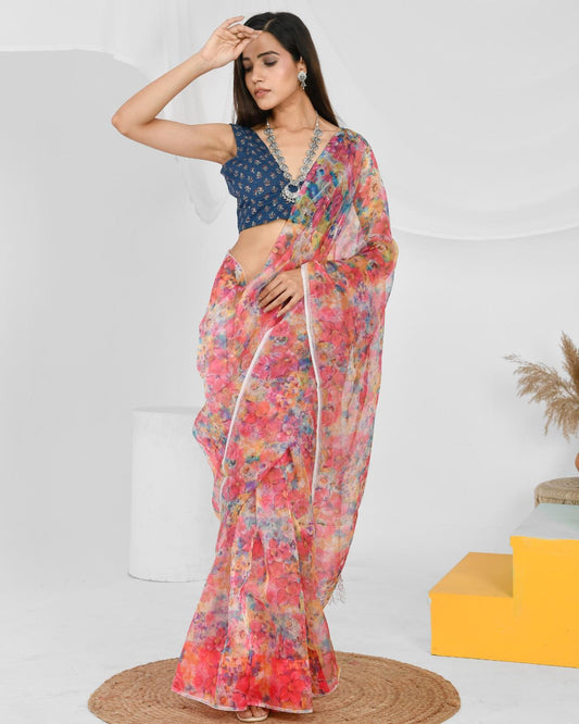 Multicolor Organza Saree With Blue Motif Blouse - Fal316