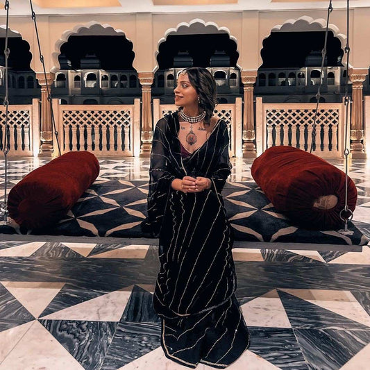 Black Handwork Saree and Wine Deep Neck Blouse - Fal3319