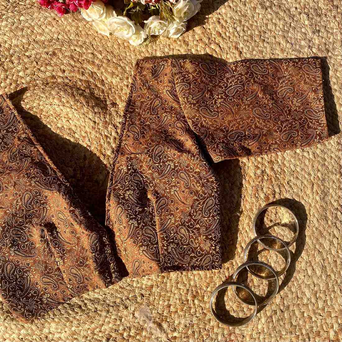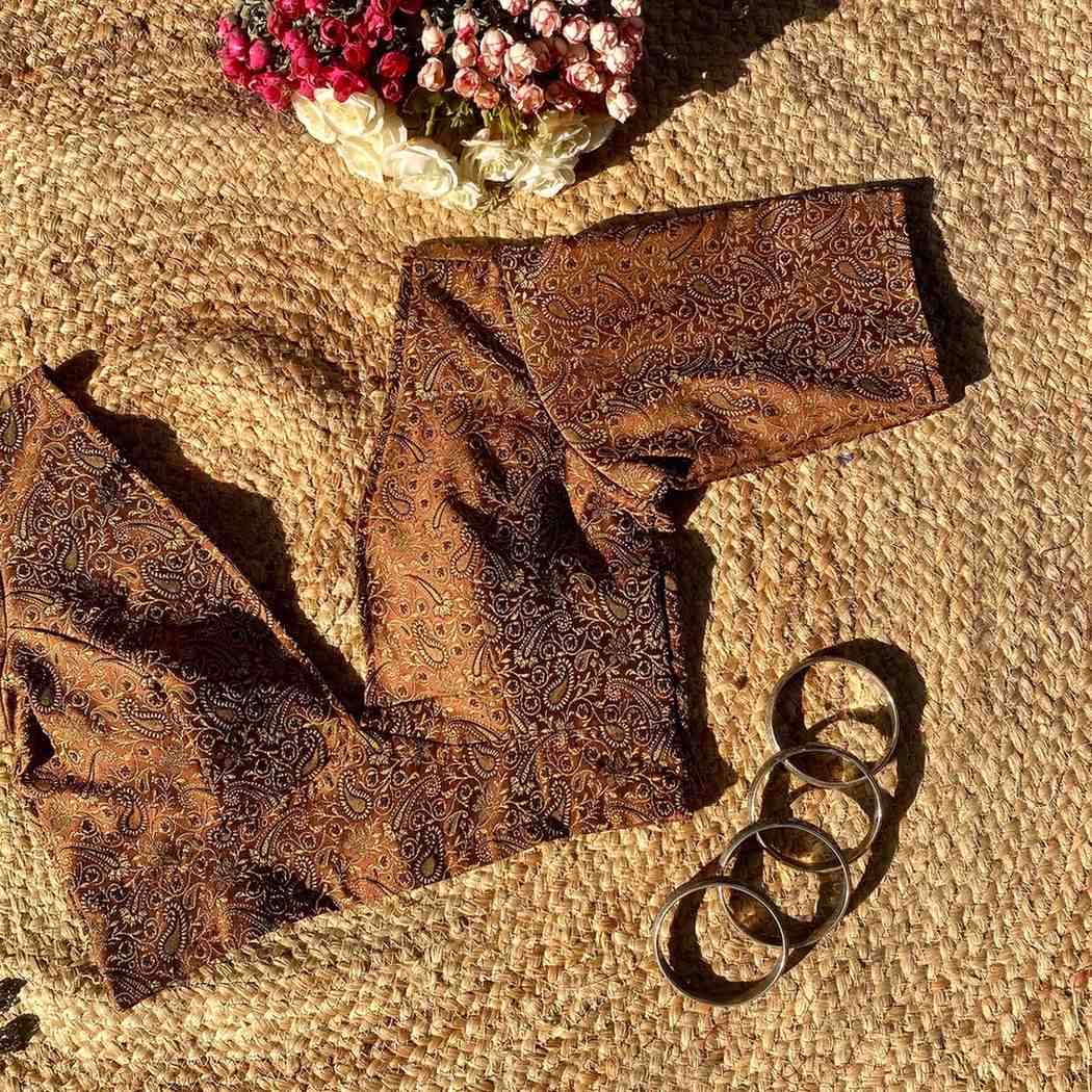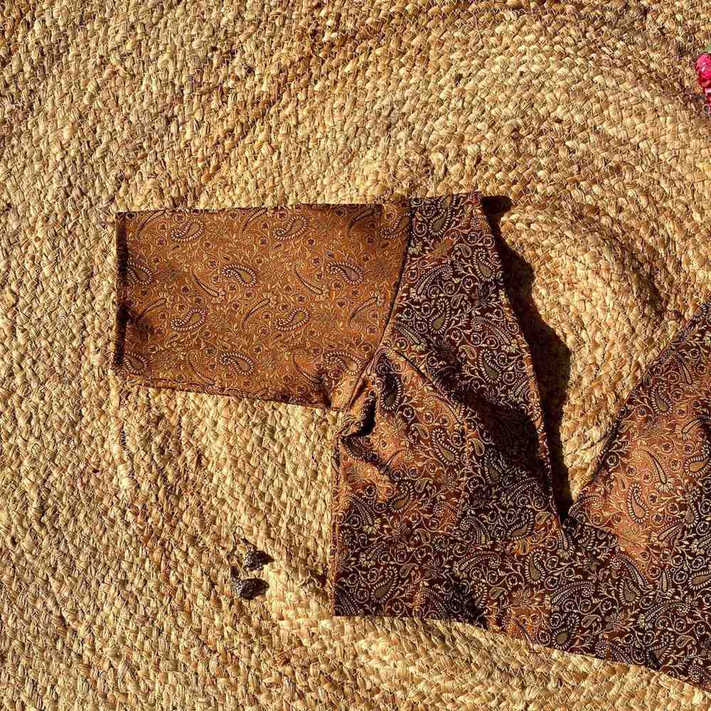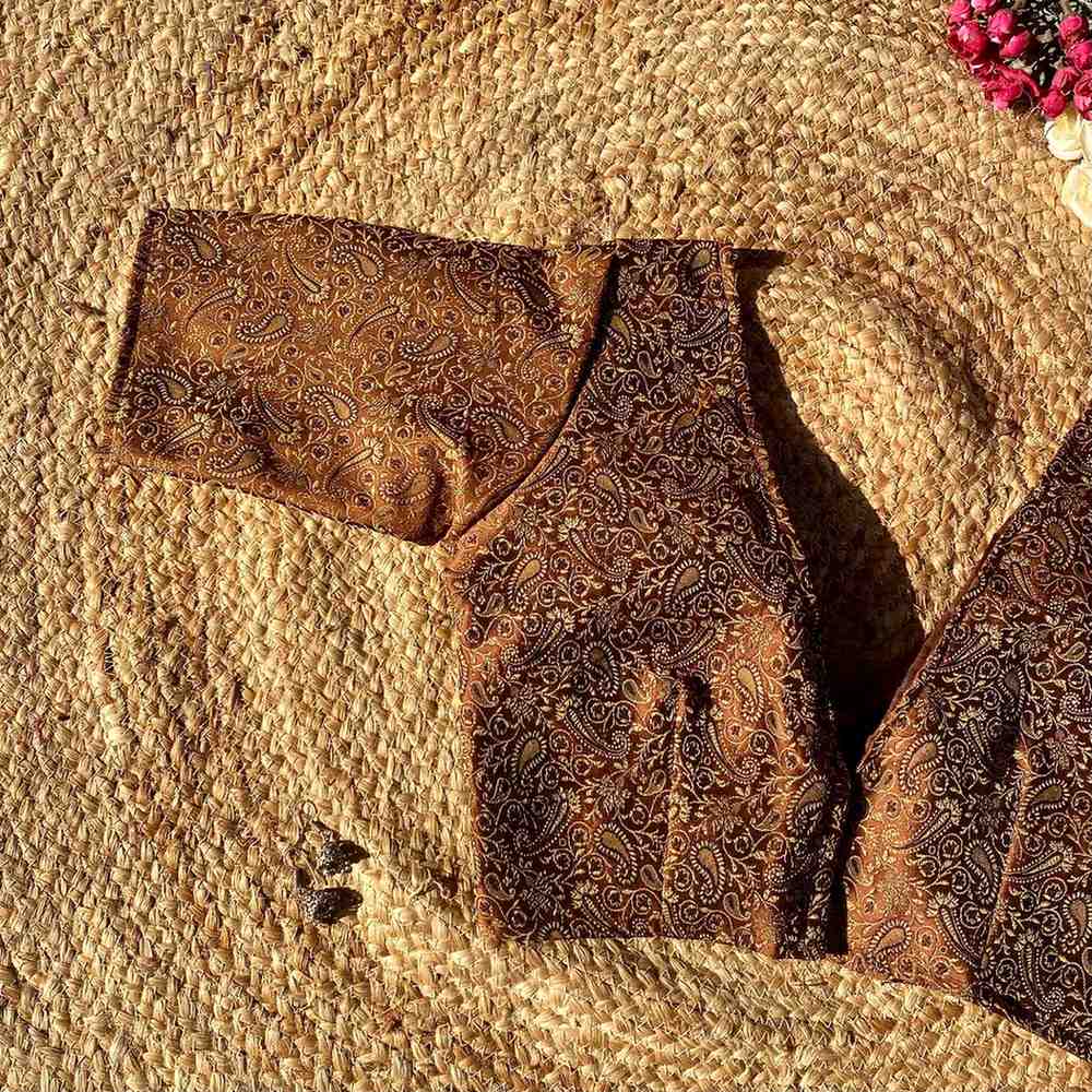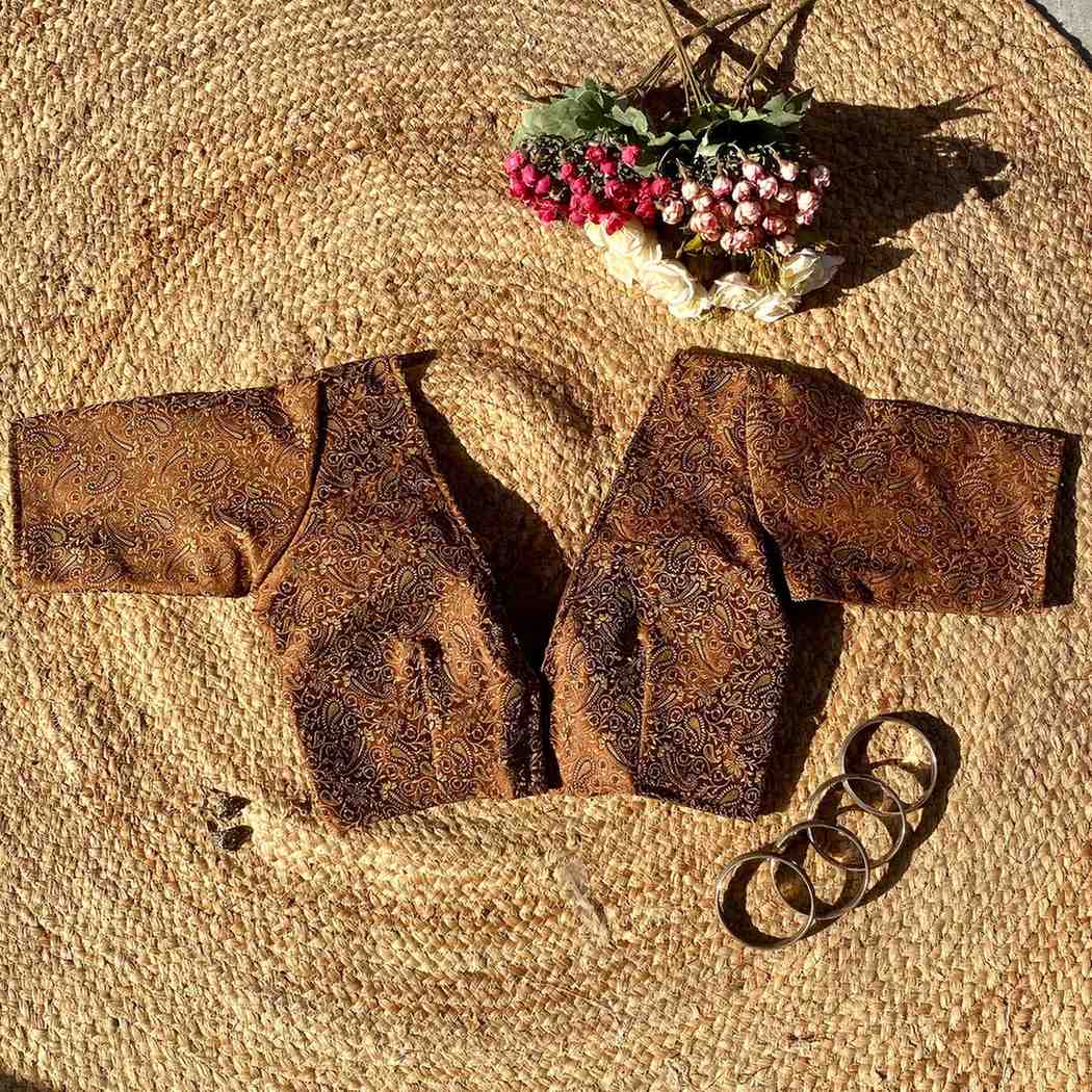 Brown Self Heavy Brocade Elbow Sleeves Deep V Neck Blouse- Fal3351