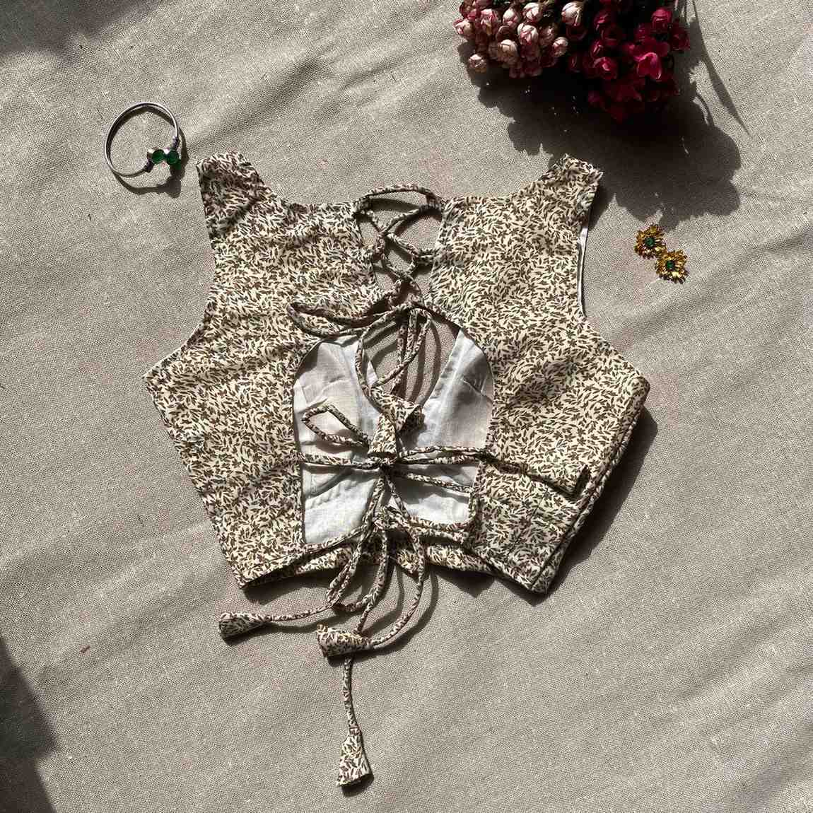 Cream Brown Jaal Deep V Neck Cotton Blouse - Fal3342