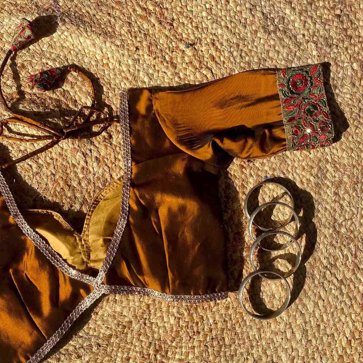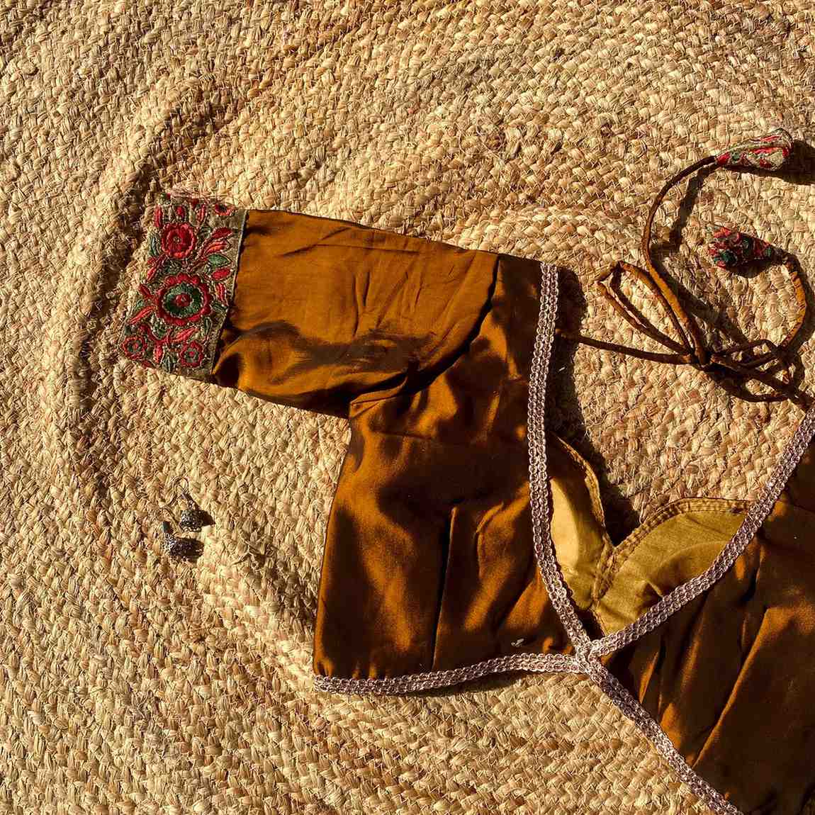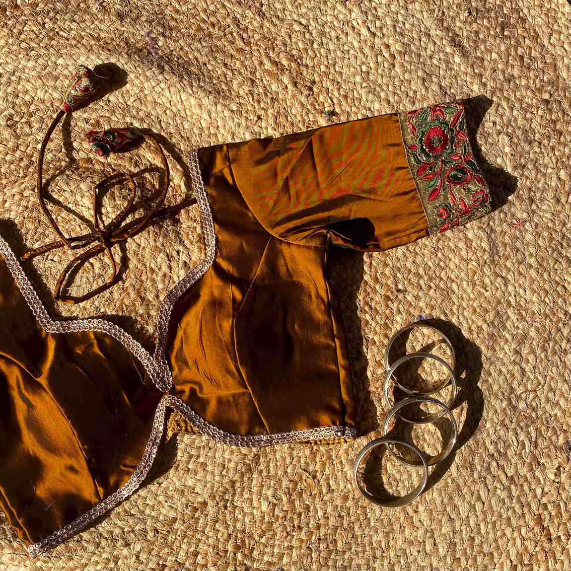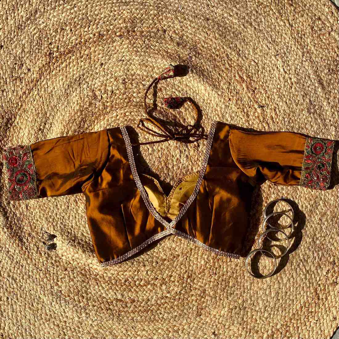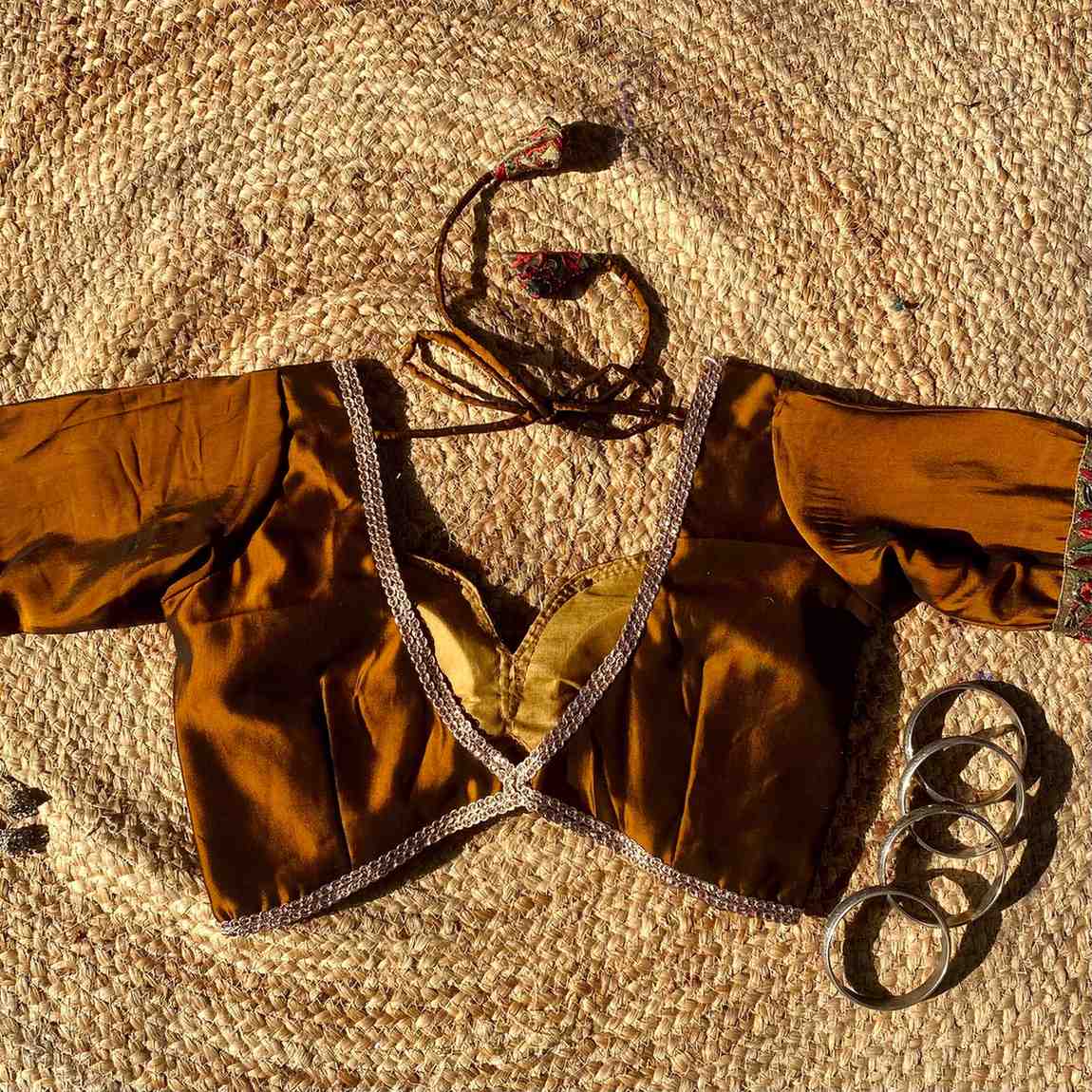 Metallic Brown Deep V Neck Silk Border Sleeves Blouse- Fal3350